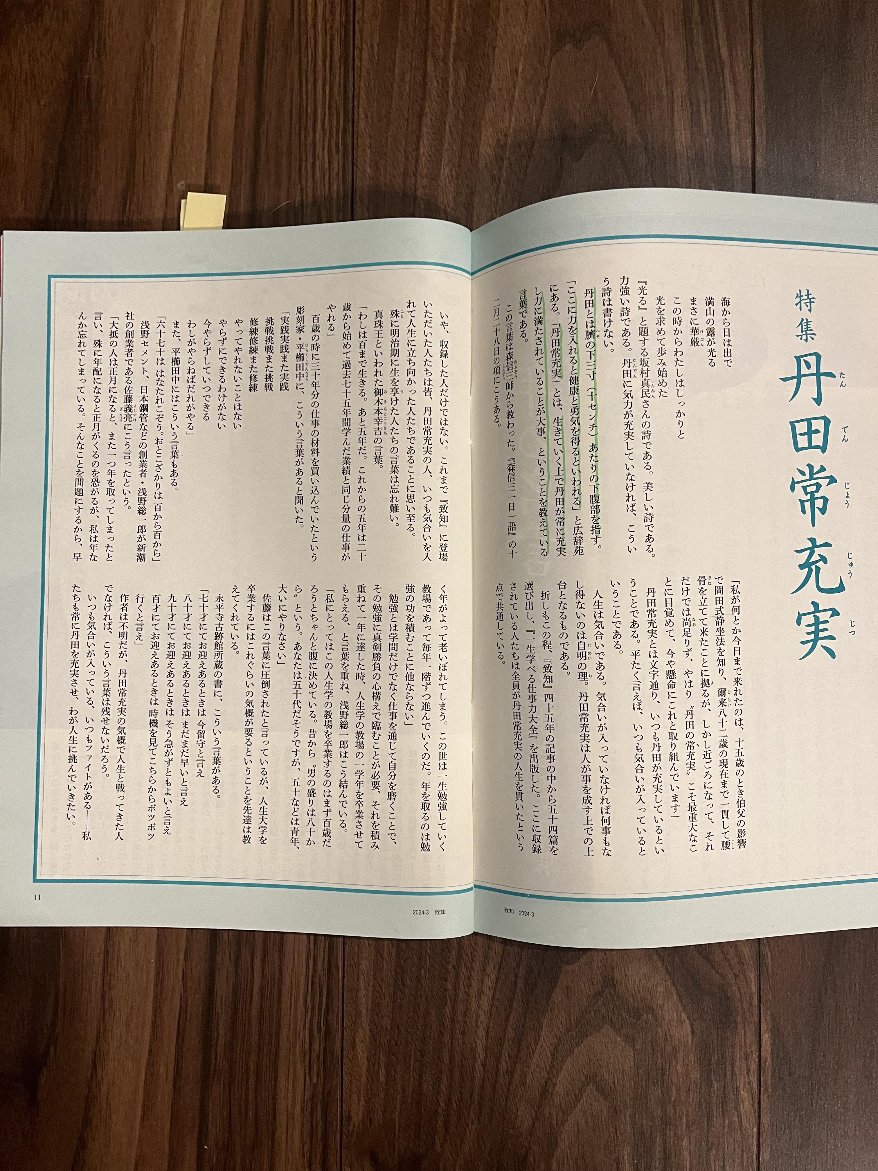 丹田充実とは文字通り、いつも丹田が充実しているという事で、平たく言えば、いつも気合いが入っているということだそうです。「致知」の3月号に掲載されている特集記事から抜粋すると、永平寺古跡館所蔵の書には、次のような言葉があり