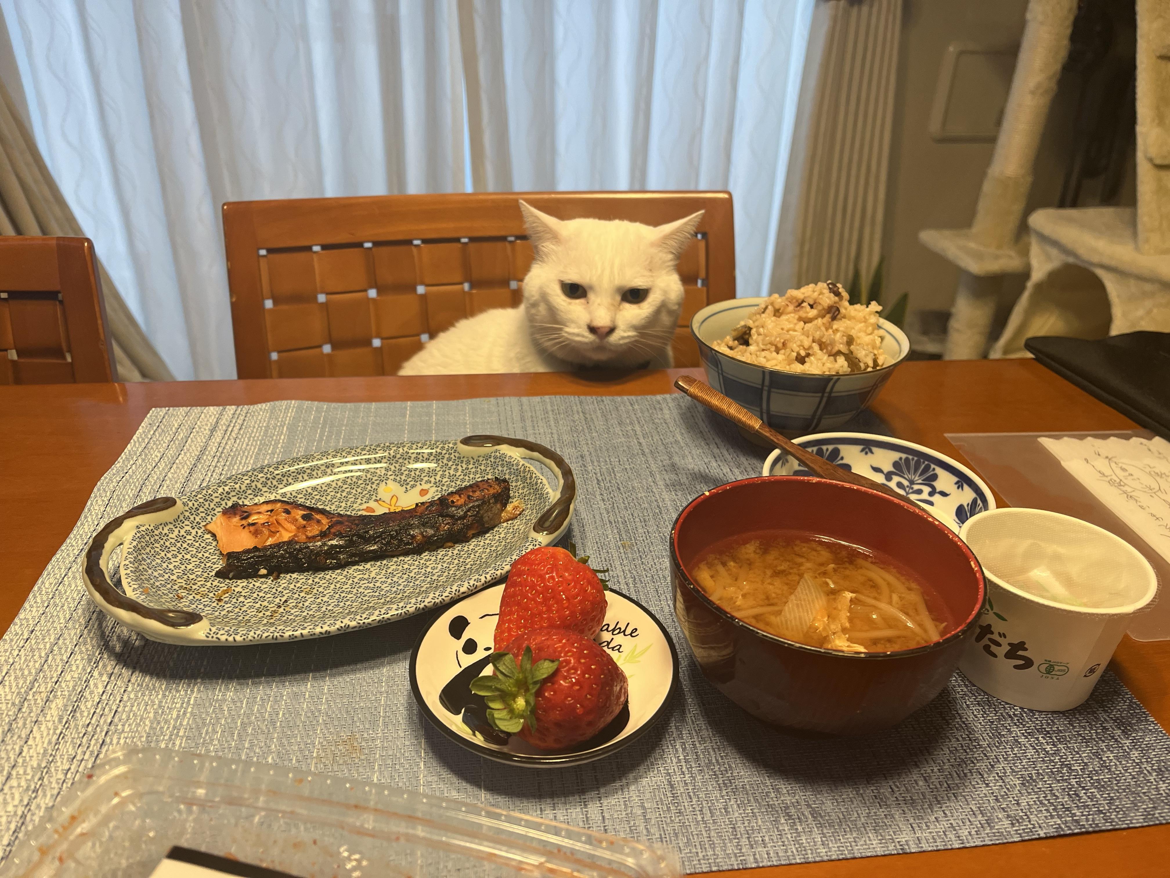 今日は2月22日で猫の日です ウチの守護猫3レンジャー達にも今日は何かご褒美あげなきゃです。 その守護猫1号のシロちゃんの今朝の様子、息子の朝ごはんを前にお行儀よく待ってます。ホントいつも守ってくれてありがとう。 これからもよろしくお願いします。